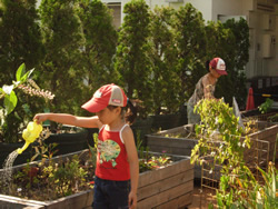 屋上の小さな農園から収穫できるほんのちょっぴりの野菜ですが、子どもたちに与えてくれる喜びは大きい!小さな自然とまず、仲良くなってほしい…HAND IN HANDの願いです。