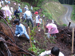 「木を植えるのは、森作りのほんの一部。 植樹を きっかけに、ぜひ、下草刈りなどの森作りの作業に参加してほしい。」